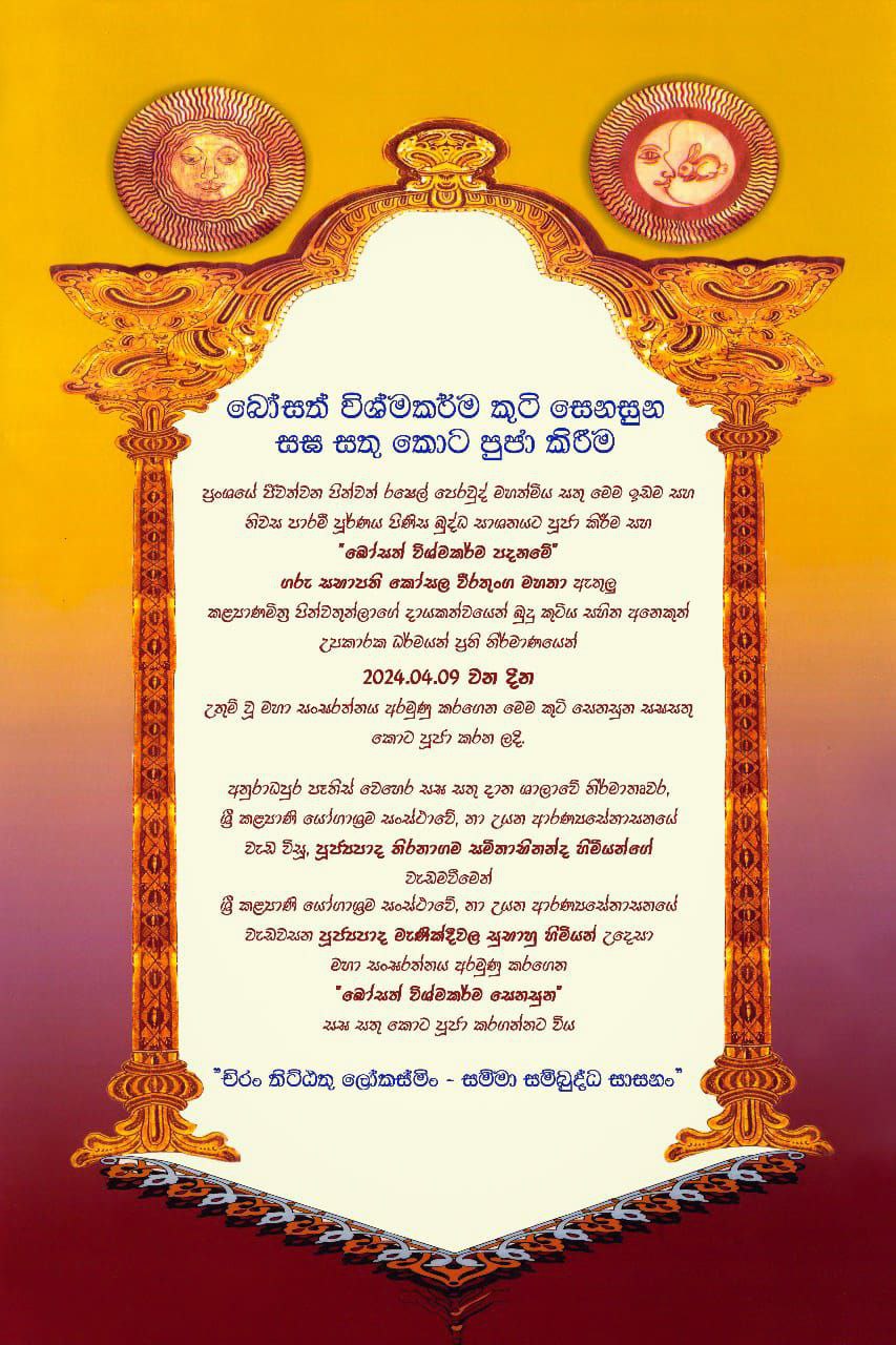 “බෝසත් විශ්මකර්ම පදනමේ” අපගේ කළ්‍යාණමිත්‍ර පින්වතුන්ලාගේ දායකත්වයෙන් මෙම නිවස සහ ඉඩම උතුම් මහා සංඝරත්නයට කැපවන අයුරින් ප්‍රතිනිර්මාණය කරමින් විශ්මිත බුදු කුටියක් සහිත අනෙකුත් උපකාරක ධර්මයන් සකස් කරමින් 2024.04.09 වන දින උතුම් වූ මහා සංඝරත්නය අරමුණු කරගෙන මෙම කුටි සෙනසුන සඝසතු කොට පූජා කරන ලදි.