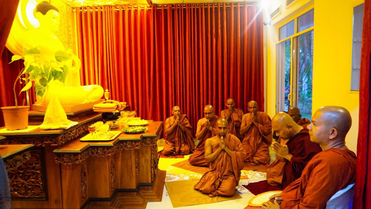 උතුම් මහා සංඝරත්නය හේවිසි ශබ්ධ පූජා මැද පාවඩ මතින් පා දොවමින්, පා පිස දමමින් ඉතා ගෞරවයෙන් යුතුව කුටි සෙනසුන වෙත වඩම්මවා උන් වහන්සේලාට සවස්‍ යාමයට කැප වූ පාන පූජාවන්, පැන් පූජාවන්, තල තෙලින් බැද ගත් සුදුලූණු ප්‍රණීතව පිලිගන්වමින් පින්වත් සුධම්මානන්ද ස්වාමීන් වහන්සේගේ මූලිකත්වයෙන් පැමිණිසිටි සැම ආජීව අෂ්ඨමක ශීලයේ පිහිටවා පිරිත් සජ්ජායනා කොට මහ සඝරුවන කාය සාක්ෂියේ තබමින් කුටි සෙනසුන සඝ සතු කරන්නට විය.