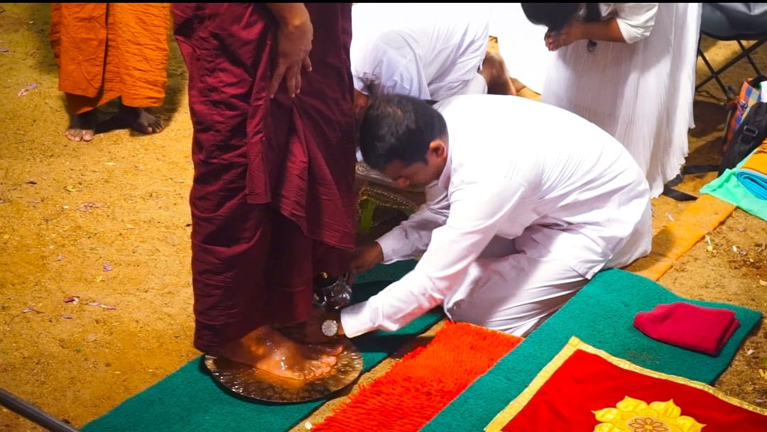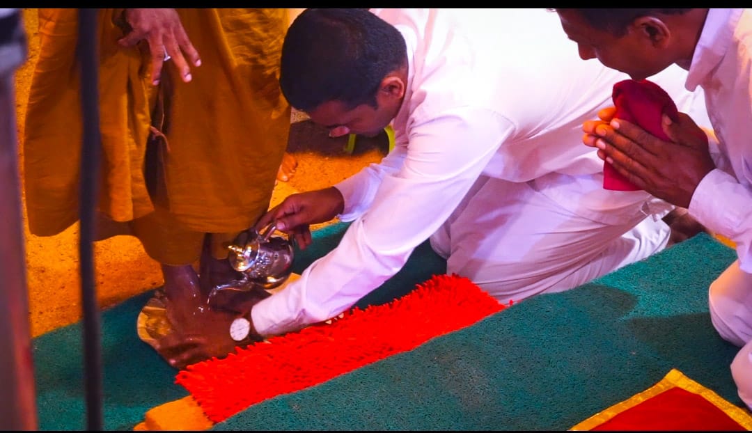 ඉතා ගෞරවයෙන් යුතුව පා දොවා, පා පිස දමමින්,