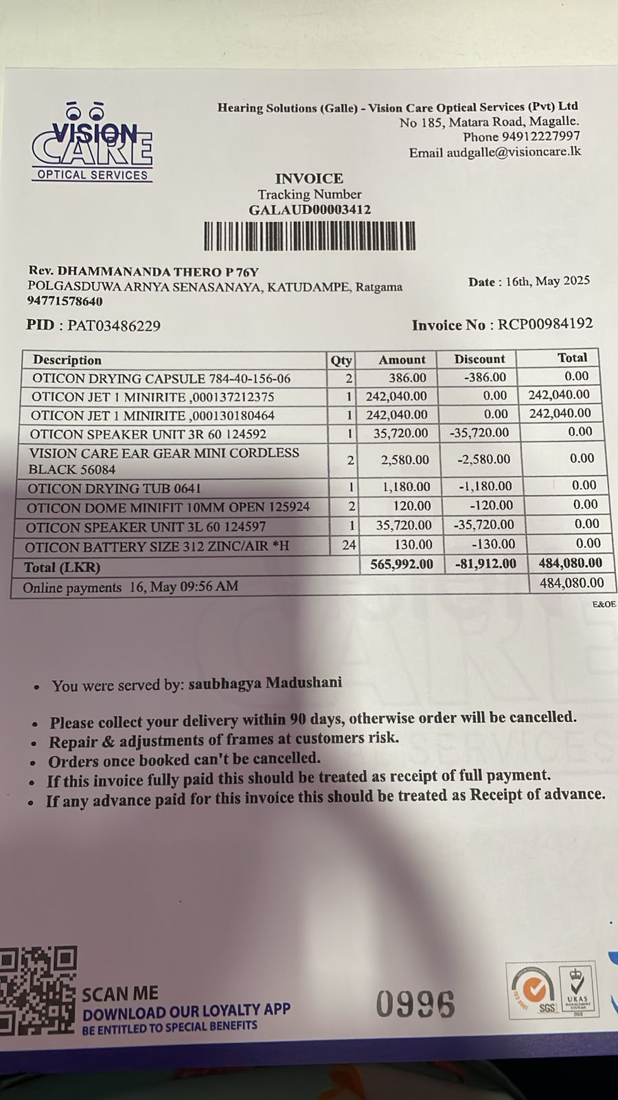Donation of Rs. 484,080/- Worth Hearing Aid to a Venerable Monk in Need