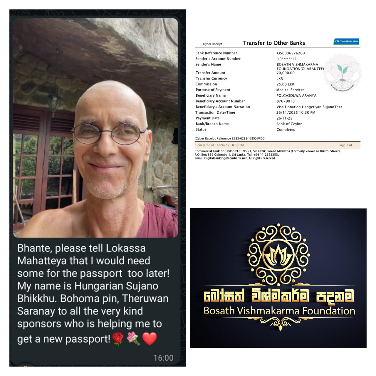 While residing and practicing at Polgasduwa Aranya Senasanaya, the devoted Hungarian monk, the venerable Sujano Thero, required assistance for the renewal of his visa. For this purpose, a contribution of LKR 70,000 was offered to support his journey to Malaysia and his safe return.